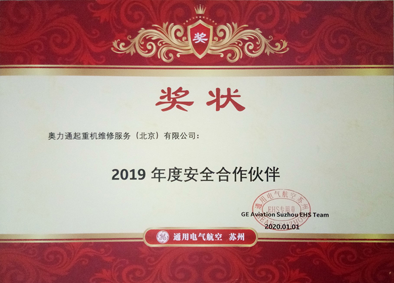 随着2020年的到来,美好的一年再度启程;新年伊始,大满贯起重机维保服务团队收到了合作伙伴通用电气(GE)航空集团的新年礼物---2019年度安全合作伙伴奖,以此表彰和感谢大满贯维保服务团队长期以来为通用电气(GE)航空集团提供的安全、质量、高效的起重机维保服务。